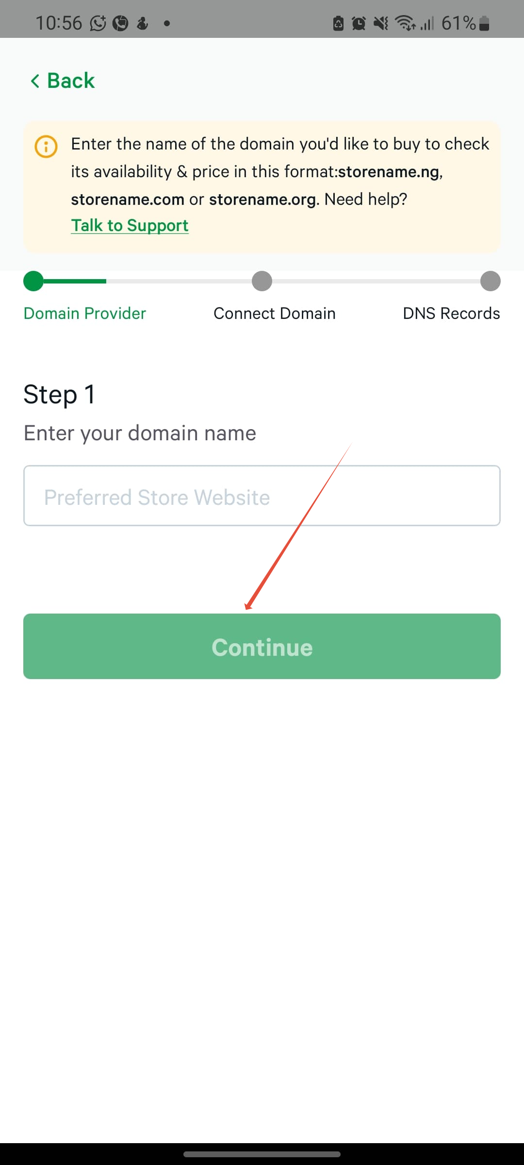 Once you have completed the above steps, email your custom domain name or sub-domain and Bumpa store URL (e.g. yourbusinessname.bumpa.shop) to [email protected] or the in-app live chat feature. This will notify the Bumpa team to verify that your domain is correctly pointed to Bumpa and it will be activated.