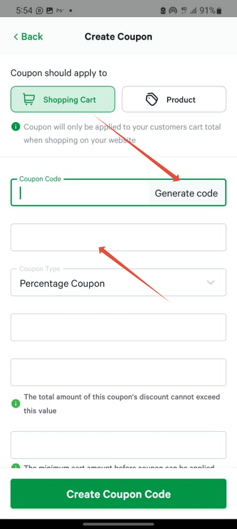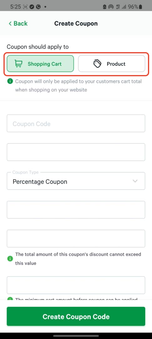 - Select between Shopping cart or product(s) to choose how you want the coupon to function