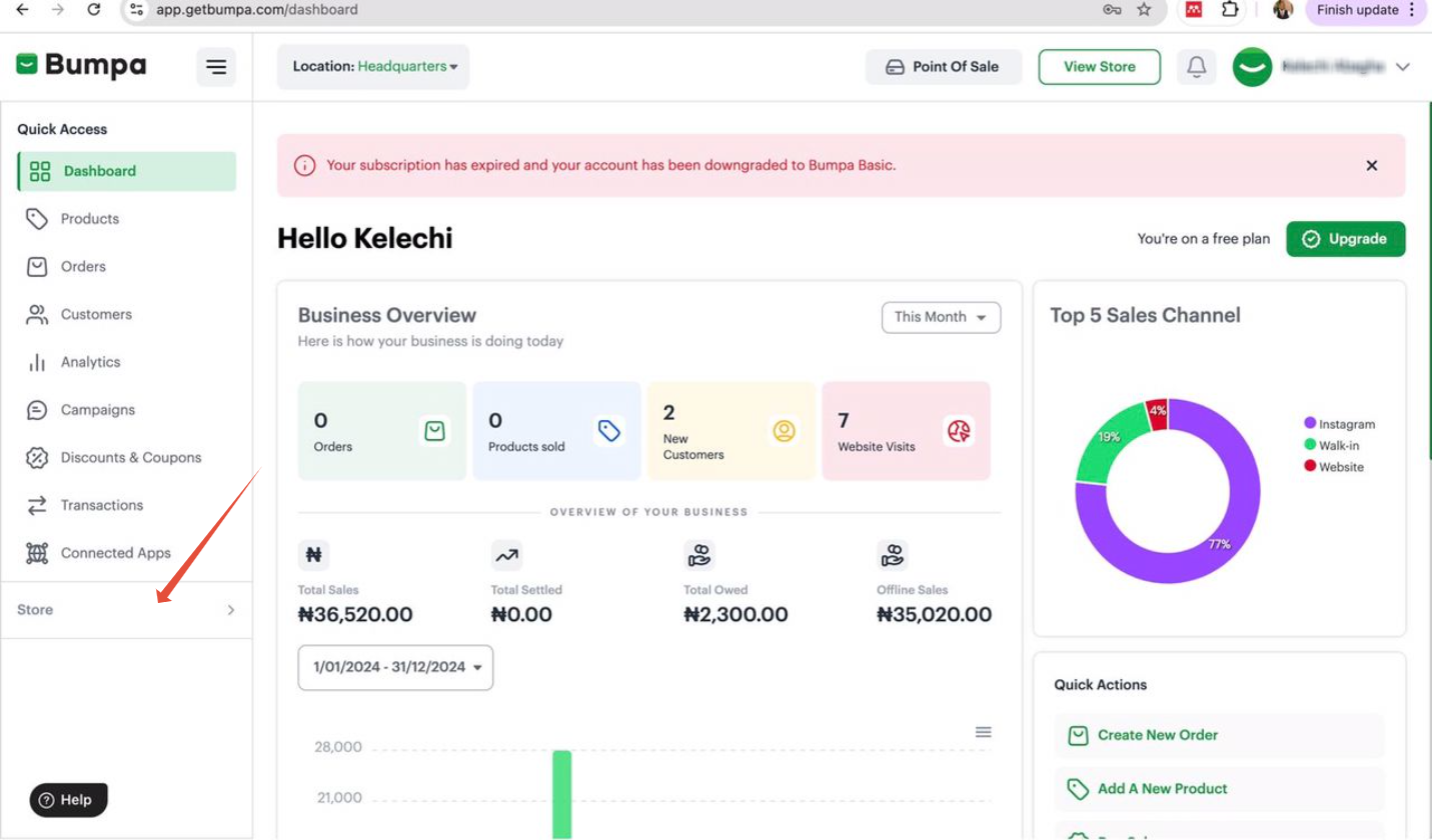 On the dashboard's left sidebar, click on Store