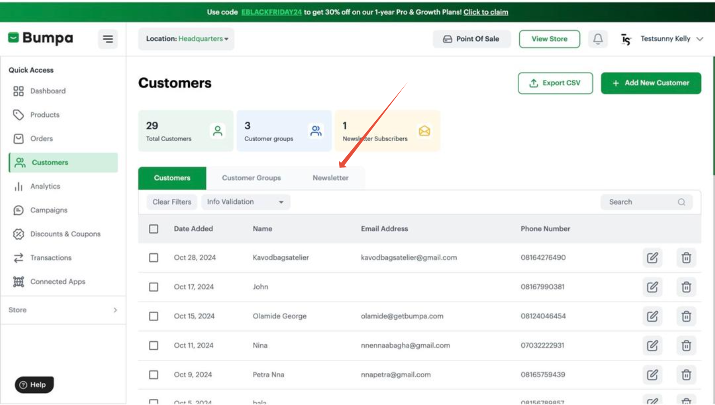 Staying connected with your audience is key to building lasting relationships and boosting your brand’s reach. With Bumpa’s newsletter feature, you can easily view and manage your list of subscribers, allowing you to keep track of those who are most interested in your updates, promotions, and product launches. In this article, we’ll guide you through the quick and easy steps to access your newsletter subscriber list on the Bumpa web app, ensuring you’re well-equipped to connect with your customers in meaningful ways.