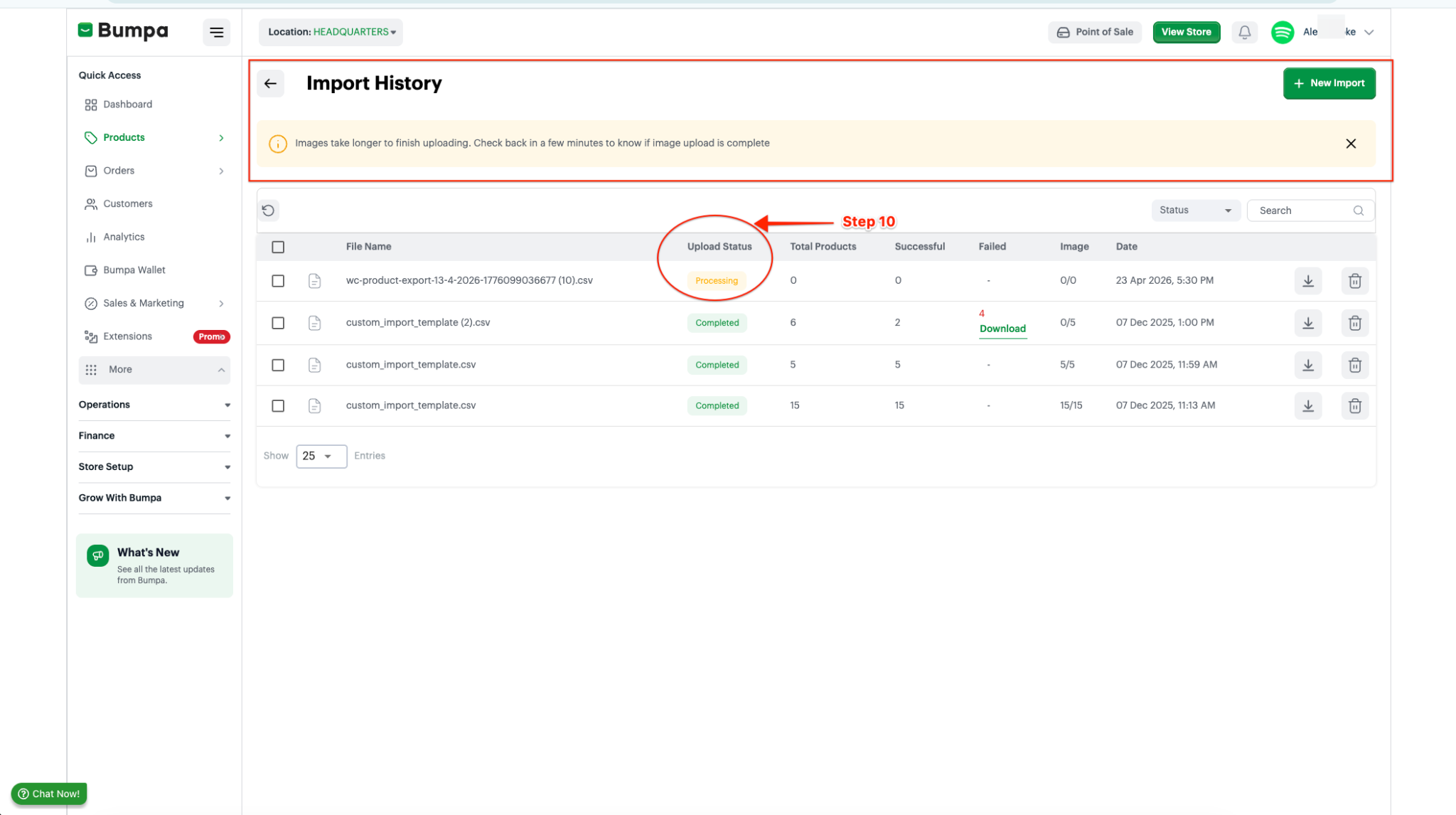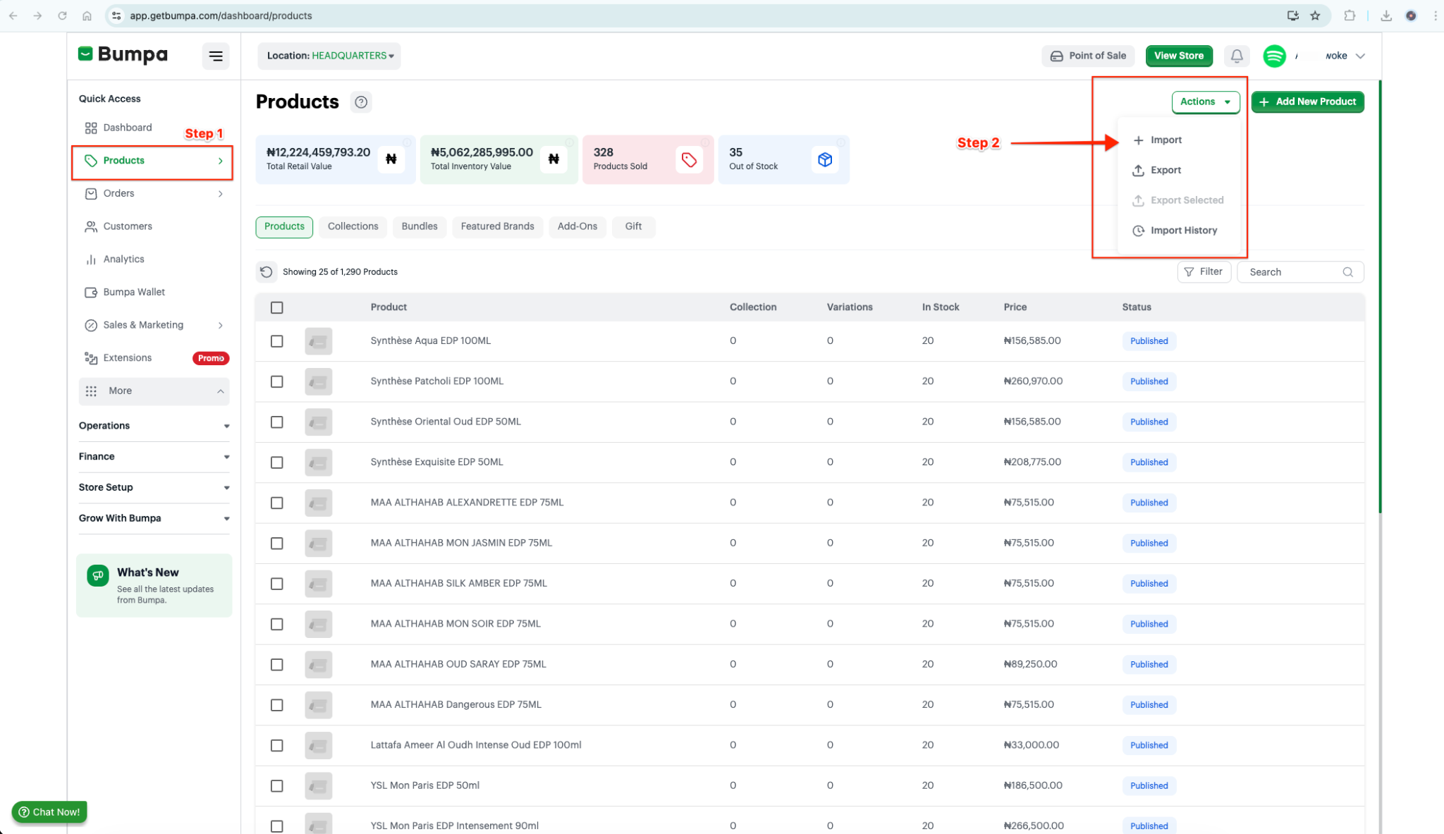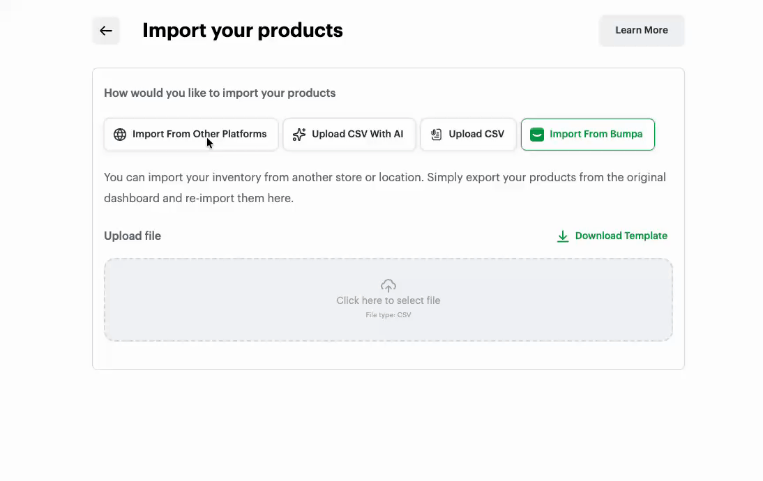 Select the Import button to begin the process of importing new product data into your Bumpa’s inventory.